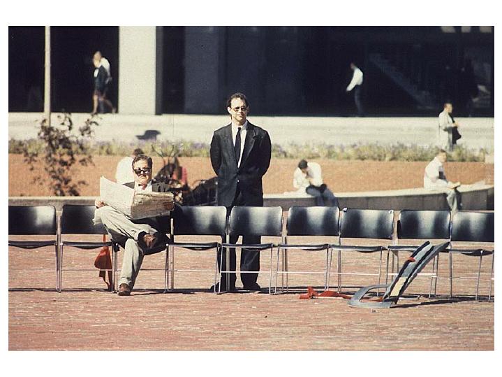 Richest 1%, bodyguard and 40 empty chairs. Performance of the 100 Musical Chairs in Boston City Hall Plaza, 1996.
